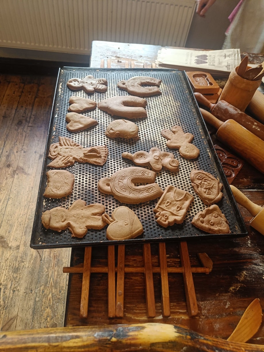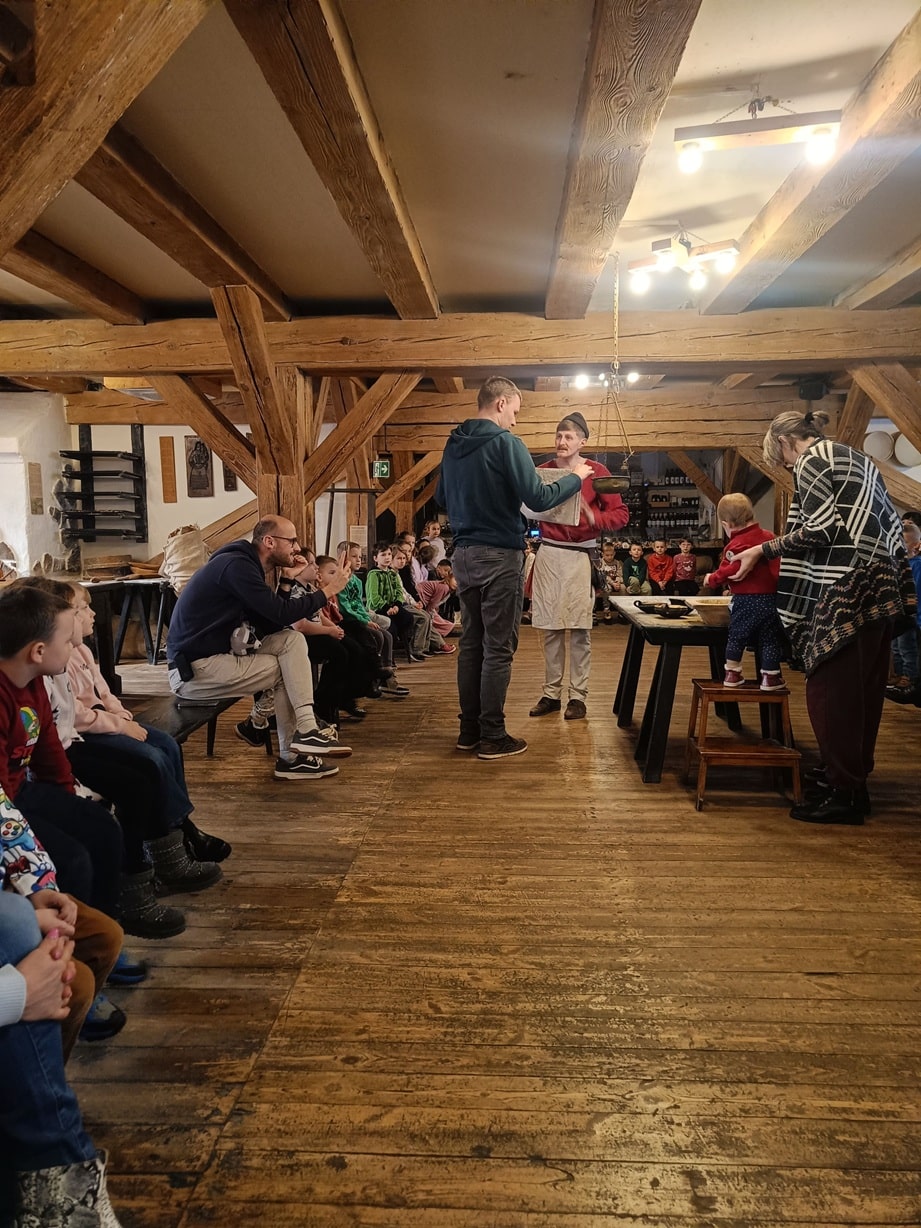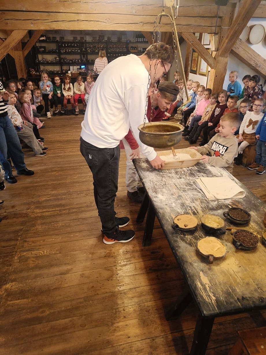 Dnia 28.11.2025 r. uczniowie Szkoły Przysposabiającej uczestniczyli w wycieczce do Żywego Muzeum Piernika. Pierwszy etap naszej wycieczki to pierwsze piętro , które w magiczny sposób przeniosło Nas do średniowiecza, w którym – pod okiem Mistrza piernikarskiego i uczonej Wiedźmy Korzennej – poznaliśmy wszelkie rytuały związane z wypiekiem piernika. Własnoręcznie przygotowaliśmy ciasto, które później, przy użyciu drewnianych form, wypiekaliśmy z niego toruńskie specjały. Druga część naszej wizyty to przejście na drugie piętro muzeum. To piętro muzeum przedstawia manufakturę z początku XX wieku, którą zarządza rodzeństwo Rabiańskich. Zobaczyliśmy tam m.in. oryginalne niemieckie maszyny służące do wypieku piernika, zabytkowy piec, kolekcję woskowych form, a każdy chętny mógł ozdobić piernik lukrem, biorąc udział w warsztatach dekorowania prowadzonych przez artystkę malarkę. Było to bardzo ciekawe doświadczenie, które przez zapachy wprowadziło nas w czas świątecznych wypieków.