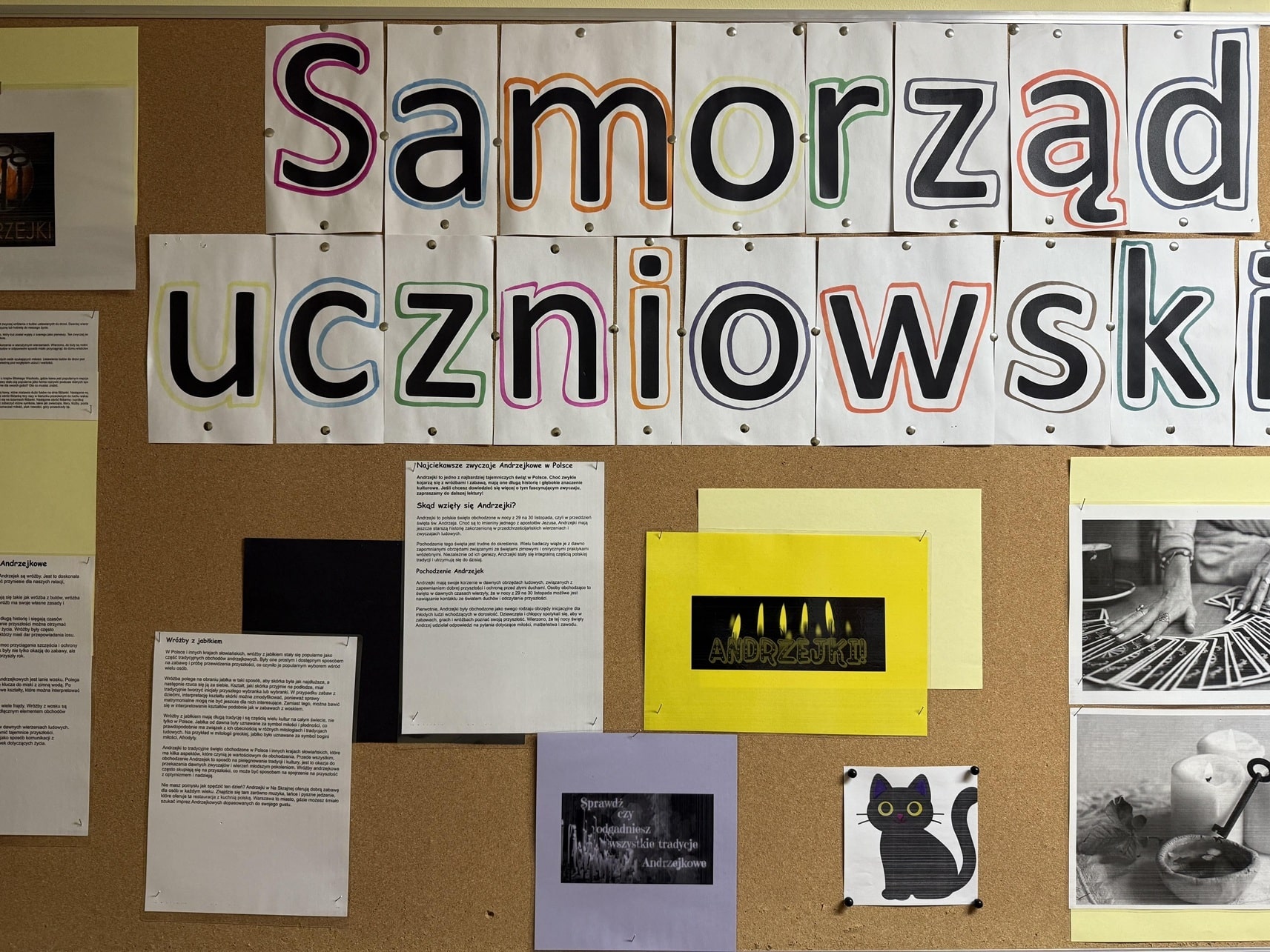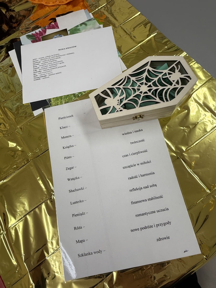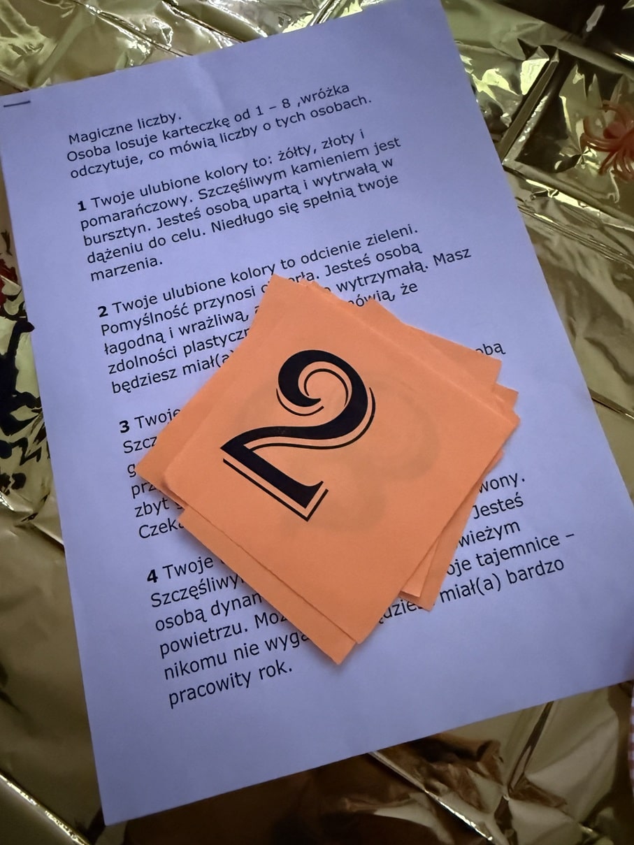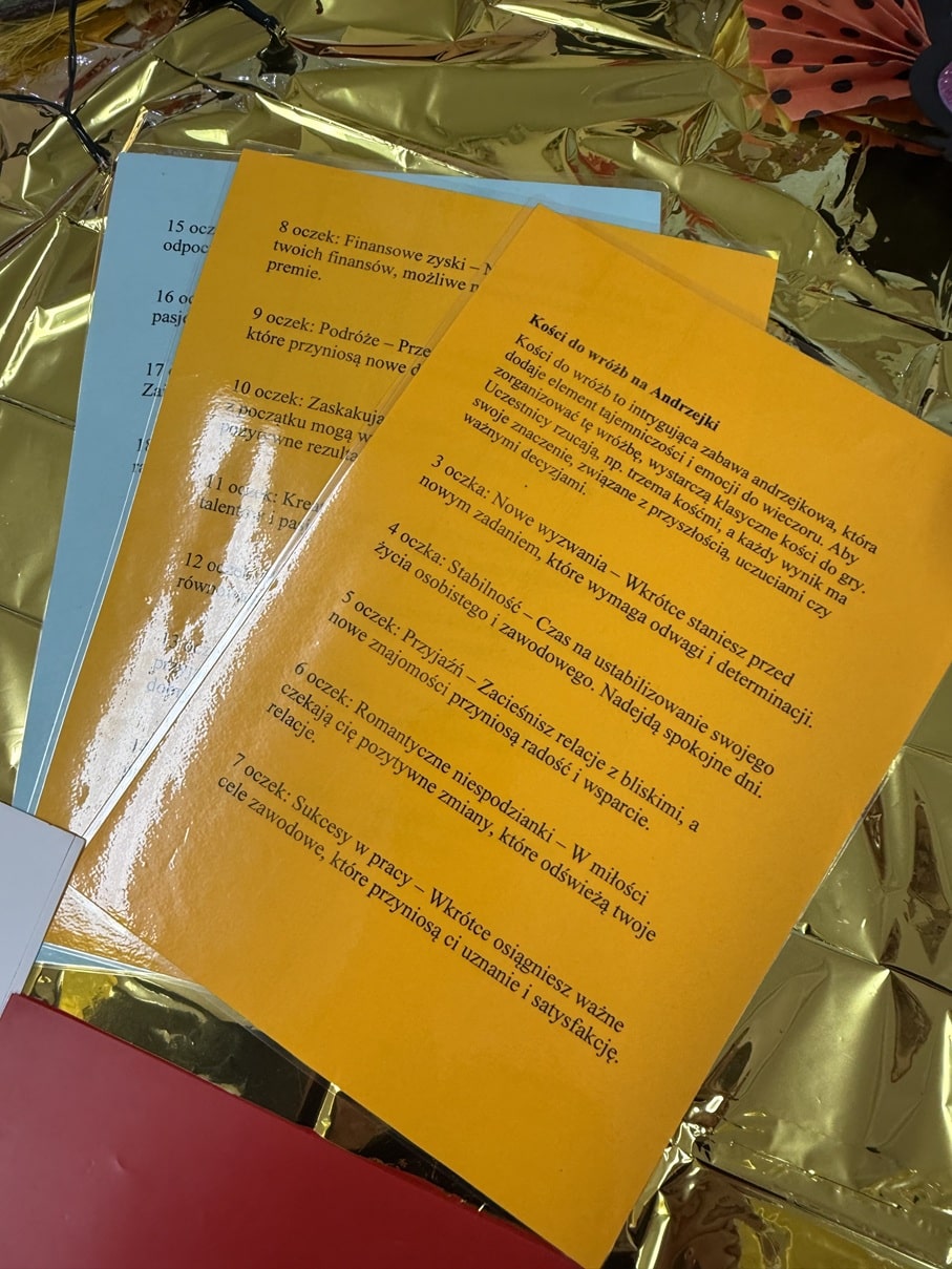 W dniu 27 listopadaw stołówce szkolnej odbyła się dyskoteka andrzejkowa połączona z tradycyjnym wieczorem wróżb, zorganizowana przez Samorząd Uczniowski. W wydarzeniu wzięli udział uczniowie różnych klas, którzy chętnie korzystali z przygotowanych atrakcji. Podczas zabawy nie zabrakło muzyki, tańców i wspólnej integracji. Na uczestników czekały również andrzejkowe wróżby, takie jak: magiczne liczby, mowa kwiatów, szpilka prawdy, kości czy poznawanie znaczenia imion. Uczniowie z dużym zaangażowaniem brali udział w przygotowanych stanowiskach, traktując je zarówno jako zabawę, jak i okazję do podtrzymania tradycji. Atmosfera była radosna i pełna pozytywnej energii. Wydarzenie dostarczyło wszystkim wielu wrażeń i stało się doskonałą okazją do wspólnego spędzenia czasu w miłej, andrzejkowej atmosferze. W szkolnym korytarzu zawisła także tematyczna gazetka.