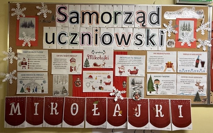 Przez cały tydzień począwszy od 5 aż do 12 grudnia w naszej szkole wiele klas obchodziło Mikołajki. Większość z nich spędziła ten czas we własnym gronie w świątecznej atmosferze. Najważniejszym punktem spotkań było rozdawanie prezentów w ramach klasowej zabawy. Każdy uczeń wylosował wcześniej osobę, której przygotował drobny upominek. Wychowawcy klas także wzięli udział w losowaniu. Wręczaniu prezentów towarzyszyły śmiech, zaskoczenie i wiele miłych słów. Po części z podarunkami wspólnie spędziliśmy czas, słuchając świątecznych piosenek i biorąc udział w krótkich grach oraz zabawach przygotowanych przez wychowawców. Były tez takie klasy, które Mikołajki spędziły w kinie ,, Za Rogiem’’ na projekcji filmu,, Uwierz w Mikołaja ‘’ świetnie się przy tym bawiąc. Była to także wspaniała okazja, aby spędzić czas integrując się poza murami szkoły. W szkolnym korytarzu oczywiście nie mogło zabraknąć pięknej gazetki tematycznej przygotowanej przez Samorząd naszej szkoły.