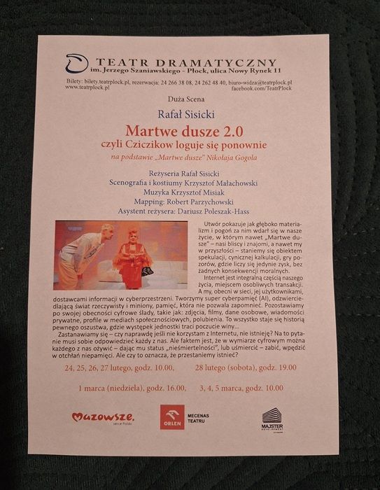 4 marca 2026 roku uczniowie Szkoły Branżowej I stopnia Nr 6 w ramach programu "Kulturalna szkoła na Mazowszu" wybrali się do Teatru Dramatycznego na spektakl „Martwe dusze 2.0, czyli Cziczikow loguje się ponownie”. Sztuka opowiada o tym jak sztuczna inteligencja wpływa na ludzkie życie oraz jak w obecnych czasach można handlować już nie „martwymi duszami”, lecz wizerunkami, danymi i pozorami istnienia w sieci. Spektakl w formie groteski i satyry stawia pytania szczególnie istotne dla młodych ludzi: • czy liczba lajków może zastąpić realne relacje, • gdzie przebiega granica między obecnością online a uzależnieniem, • czy wirtualna tożsamość nie zaczyna wypierać prawdziwego „ja”. Obcowanie ze sztuką oraz tak bliski kontakt z aktorami dostarczył zarówno uczniom jak i kadrze pedagogicznej niezapomnianych wrażeń.